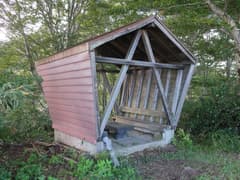 左側の低木林の中には、豪雪地帯らしく、錆びた鉄製の雪崩予防柵が見え隠れする。黒岩山の頂上(911m標高点)は真っ平な道の途中で、山名標識の類は何もない。もうちょっと先に進んでみると、僅かに下ったところに東屋があり、若い4人組パーティーが休憩中。