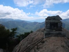 傾斜が緩むと岩場が現れ、左から回り込んで笠ヶ岳の頂上に登り着く。頂上には三角点標石と大岩、そこそこ休憩できるスペースがある。大岩の上には屋根が平石の石祠があり、そこに上がると北面を除く三方が見渡せる。