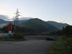 二居に5時半に到着し、田代ロープウェイ山麓駅の広い駐車場(閉鎖中)と車道を隔てて二居川の側にあるだだっ広い駐車場に車を置く。日の出の直前で周囲の山はまだ暗いが、上空は明るく、青空が広がる。山に纏わり付いている雲も薄く曙色に染まり、時が経てば消えるだろう。天気予報の通り、今日は絶好の登山日和だ。準備を整え、R17に出たところにある二居田代スキー場前バス停で、6:36の西武クリスタル前行のバスをのんびり待つ。