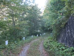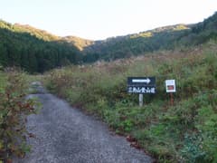 バス停から、旧三国街道の標識のある裏通りに入る。左手に浅貝スキー場跡の、今は草に覆われた斜面が現れ、「三角山登山口 所要時間2時間30分 平標山←三角山→三国峠」の道標が立つ。
