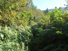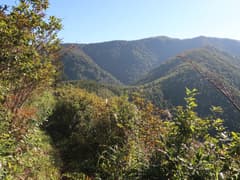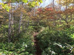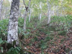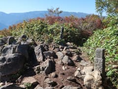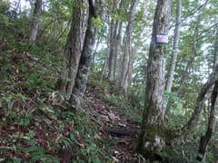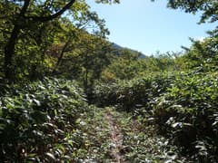 登山道に入り、スキー場跡を抜けて山腹をトラバースし、広葉樹林に覆われた尾根を登り始める。所々に「KWV 浅貝新生会」と記されたプレートがあり、急坂にはロープが張られて、良く整備された登山道が続く。木々の葉はほんのり色付き始め、もう少し経てば良い色合いになりそうである。
