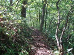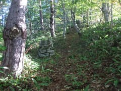 この山道は青年会新道という。昭和34年浅貝と三国山脈を結ぶ最短のルートとして浅貝青年会が開発したが、歩く人無く笹薮に戻った。平成10年KWV有志により再開発され、浅貝新生会が維持している。末永く多くの人がこの道を歩き続けることを願う。平成22年8月 浅貝新生会 慶應義塾大学ワンダーフォーゲル部