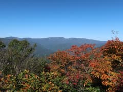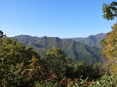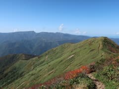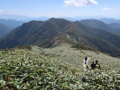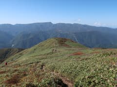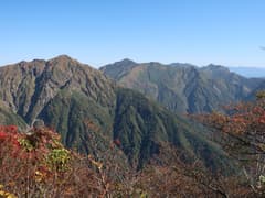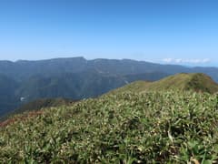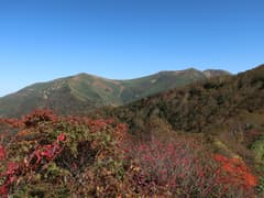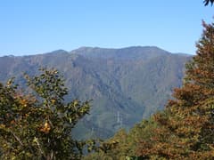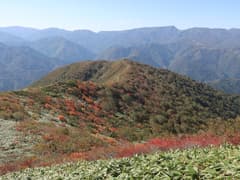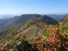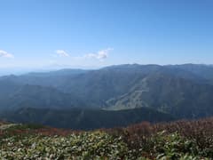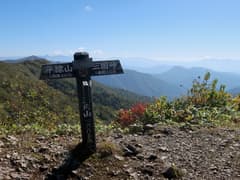 樹林の中を登ると頂上稜線の一角に出て、笹原から南面の眺めが開け、三角山の頂上が見おろせる。三角山から三国山、稲包山へと延びる上越国境稜線を望み、浅間連峰の山影を遠望する。笹原と紅葉した低木の稜線を緩く辿って、大源太山の頂上に着く。