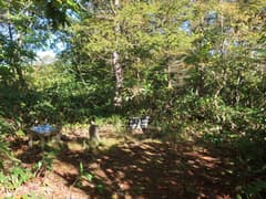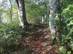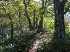 ブナ等の樹林に覆われ、そう急ではなく一定斜度で直線的な尾根の下りが続く。笹は広く刈り払われ、路面は柔らかくて歩き易く、気持ち良い下りが続く。ところどころ滑り易いのは注意。単調な下りで睡眠不足がどっと出て、道端にシートを敷いて一眠りしていたら、歩く人はいないと思っていたのに、ソロハイカーさんが下って来た😅