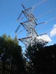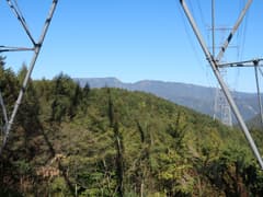 尾根の直下を進むと、頭上に巨大な送電鉄塔が現れる。この送電線は毛無山の送電鉄塔を通るものと同じ。林道は右に切り返して、急な山腹を斜めに下る。谷に近づくと樹林が切れて、平標山の頂が見上げるような高さにある。いやー、随分下って来たなあ。ここと頂上の標高差は1000m近くある。平標山から北へ峰続きの日白山や東谷山も仰がれるが、見える地点は限られる。