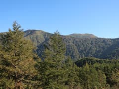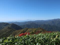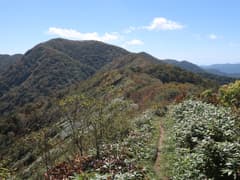 さらに尾根を急登すると小ピークに着き、その先は平坦な尾根となる。右側の樹林が切れて、小さく突き出たピークが目を引く向山(1432m)や、その奥の稲包山が眺められる。