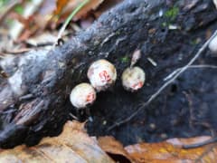 尾根上にはほんのりと黄葉が始まったブナが多く立ち並ぶ。カエンタケは見つからないが、足元にクチベニタケを発見。名の由来は見ての通り。初めて見るきのこで珍しい。