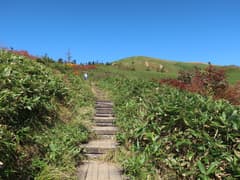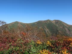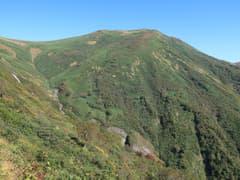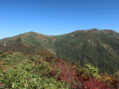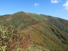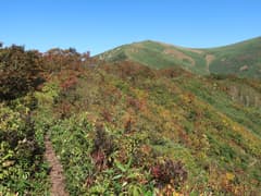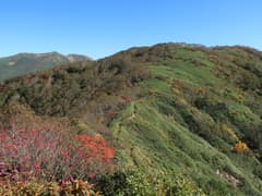 登山口から、スキー場跡の中の舗装された作業道を登る。スキー場の跡地というものは、かつてのスキーブームを思うと侘しく感じるが、ススキの穂や色づいた草葉が秋の深まりも感じさせて、風情がある。振り返れば、浅貝の高層ホテル群の向こうに苗場スキー場(こちらは健在)が見え、その右には苗場山の頂が僅かに覗いている。