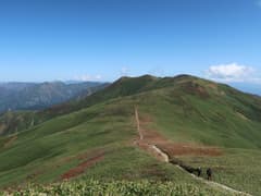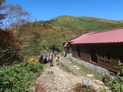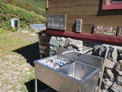 明るく爽快な尾根道を辿って平標山ノ家に着く。小屋の周囲のベンチやテーブルでは、大勢のハイカーさんが休憩中。ここから平標山のメインコースとなり、ハイカーさんの数がグッと増える。小屋の外に仙平清水と称する水場があり、塩ビパイプからバンバン流れ出す冷たい水を掬って飲む。テン場もあり、数個のテントが張られている。WCはチップ制。