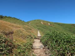 しばらく休憩したのち、平標山への登りに取り付く。ほぼ頂上まで見通せて、笹原の中に一直線に木の階段道が続く。メインコースなので大勢のハイカーさんと交差する。この階段は段差があって、なかなかきつい。下りに取るのが吉だ。