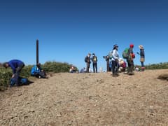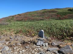 コブを一つ越えて下り着いた小さなザレ地には九合目の標識があり、登りの途中と思しき大勢のハイカーさんが休憩中。ここには大山祇の石碑がある。