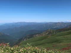 頂上からは、遮るもののない正に360°の展望が開ける。南西には苗場スキー場を俯瞰し、その奥に上ノ倉山を遠望、右に佐武流山、苗場山と長大な山並みが続く。