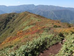 一通り展望をカメラに収めて縦走路に戻り、平標山に向かう。山腹の巻き道から主稜線上に出ると、木立が低くなって展望が開け、再び谷川連峰のパノラマが展開する。歩を進めるとグングン近づく平標山、仙ノ倉山の眺めが素晴らしい。右にはスラブやナメ滝が連続する笹穴沢を見おろす。振り返って眺める大源太山も良い色合いに染まっている。