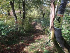 作業道を大きく蛇行して登ると「三角山登山道」の道標があり、右に登山道が分岐する。道標の隣りには「毒キノコに注意!」との新し目の看板が湯沢町の名義で立てられている。曰く、猛毒のカエンタケが発生しており、触れるだけで皮膚が爛れるので、絶対に触るな、とのこと。カエンタケの写真付き。カエンタケがあるなら、是非見てみたい。