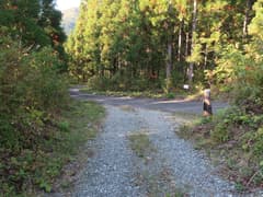 傾斜が増してジグザグに下ると程なく道標が現れ、尾根上から離れて右に下る。すぐに林道終点に付き、「松手山林道終点」の標識がある。あとは林道を下る。未舗装道だが路面は良好で、車でも走れそう(ただし、山麓にゲートがあって侵入不可)。