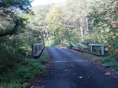 大きくジグザグを切って、ようやく谷底に下り着き、枯れ沢を渡ると林道分岐に着く。道標あり。舗装された林道を下り、地王堂川に架かる橋を渡る。この橋の欄干は太いL字鋼だが、ぐんにゃりとひしゃげて、積雪の多さと重みが察せられる。