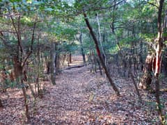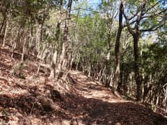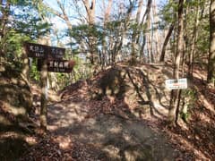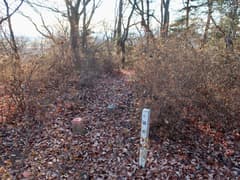 ここからはメジャーなコースから外れるが、道型は良く踏まれている。やがて左側にフェンスが現れ、それに沿って尾根道を緩く下る。少し登り返して小さく上下すると、新田山(しんでんやま)頂上に着く。「足利百名山第64座新田山」の標識がなければ通り過ぎてしまいそうな地味な頂だが、未踏の足百をまず一つゲットして嬉しい。