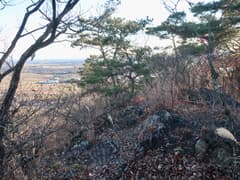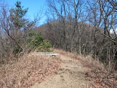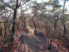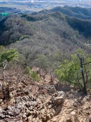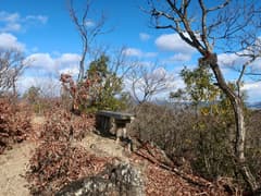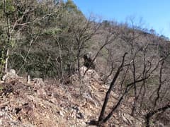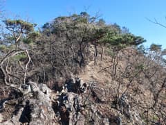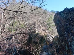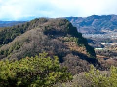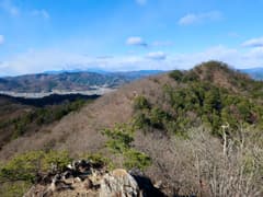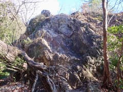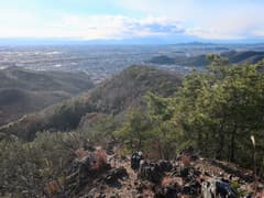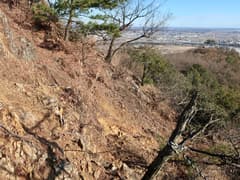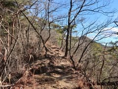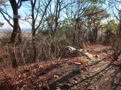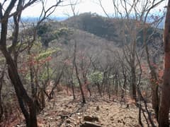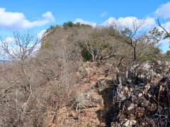 さらに南に尾根を辿り、見晴台・阿夫利神社への道を左に分け、「←大久保町」の道標に従って直進。短い急坂を登ると、ベンチがあって見晴らしの良いピークに着く。振り返ると大小山、妙義山が形良く眺められる。ピークを越え、山百合学園へ下る尾根道から左に分岐してガレ場を横断する。里山ながら岩場が多くて、なかなか楽しめる。