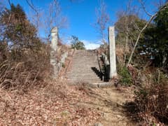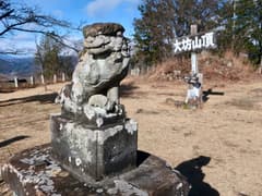 冬枯れの明るい尾根を登り、4基の石灯籠を通って参道石段を上がると、大坊山の広く平坦な頂上に着く。石段や石畳、狛犬、社殿の土台が残っていて、往時の神社の立派さが想像できる。失われた社殿に代わって、奥に小祠がある。芝生に覆われた広場の中程に三角点標石があり、妙に大きく「大坊山頂」と書かれて、前回の山行でも印象に残って良く覚えている山名標識が立つ。山頂からの展望は、少し木の梢に邪魔されるが、西から南にかけて開け、関東平野が一望できる。休憩適地だが、今日は吹きっさらしで寒い。もう少し進んで、風を避けられる場所があれば昼食にしよう。