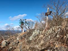 一通り展望を楽しんだのち、風が強くて寒いし、この先の行程もそこそこ長いので、後ろからグループの嬌声が迫って来たのを潮時にして山頂を辞す。南へ岩の多い急坂を下り、登り返して大小山(鷹ノ巣山)に着く。振り返ると、妙義山の頂に複数の人影が見える。