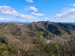 大坊山から北へ向かう。少し下ると岩尾根上の道となり、展望が開ける。行手には長林寺からの縦走路の稜線と、小さく尖ったつつじ山、大岩山〜行道山の山並みを眺め、白く寒そうな雲が頂にかかった赤城山を遠望する。