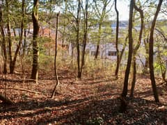 さらに縦走路を辿る。行く手には小さいがツンと尖ったピークが見え、結構下って登り返す。露岩が多く、展望と変化に富む尾根道が続く。右手の谷間に足利病院を見おろし、その向こうに大坊山を望む。登り着いたピークには「あいの山」の小さな山名標識がある。ここも展望が良い。