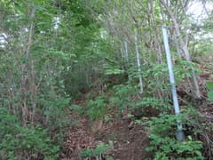 水晶山から、先日の雨で湿って滑り易い急坂を下る。迂回路と合流し、アカマツと雑木が混じる尾根を下ると芝峠に着く。左に林道水晶線への道を分けるが、右の傍陽(そえひ)側の斜面は密な低木藪に覆われて、はっきりとした道型は見当たらない。