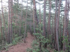 側道を少し戻ったところの農道の入口に「大峰山登山口」の標識がある。柴犬を連れて朝の散歩中のおばさんと出会って挨拶、犬をナデナデする。農道のすぐ先から山道に入って尾根に乗り、高速の切通しの縁に張られたフェンスに沿って登る。道型は明瞭だが細く、左右から枝葉が被さり気味。蜘蛛の巣が多いのは、まあ仕方がない。『信州ふるさと120山』によると、途中に石切場跡があるそうだが、そのようなものは見ずに通過。ゆるゆると尾根上を登ると、やがてアカマツ林に入る。今度はアカマツ林への立入禁止を示す古い鉄条網に沿って登る。「松茸山につき入山を禁ず」の掲示もある。