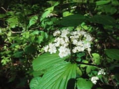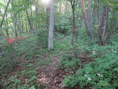 樹林に覆われて展望はほとんどない。木立の隙間から御堂川の谷を隔てて、大道山辺りのなだらかな稜線が見える程度だ。花も端境期に入ったようで、ヤマツツジが僅かに残る程度。鮮やかな緑の雑木林に覆われた尾根を一直線状に登る。途中、大平(おおでいら)という広場があるそうだが、それもどこと分からずに通過。展望のない尾根道をひたすら登って、緑一色の単調さにちょっと飽き始めたころ、大峰山の頂上に着く。