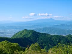 頂上には三角点標石と金属製の山名標識、風化した石祠、「大峰学級坂城中学校」の文字が掠れた標柱があり、周辺で数株のレンゲツツジが咲いている。南面の樹林が切り開かれて展望が開ける。目の前に太郎山〜虚空蔵山の稜線を見おろし、塩田平を俯瞰。その奥に鋭い山襞を刻む独鈷山を望み、さらに蓼科山や美ヶ原を遠望する。これほどの好展望が得られるとは予想していなかったので、すっかり嬉しくなる。