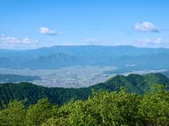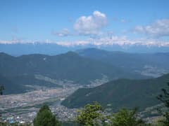 頂上からは西側の眺めが素晴らしい。西面は急峻で、坂城の市街と千曲川を眼下に俯瞰する。千曲川を挟んで大林山から冠着山の青々とした山並みを間近に望み、その向こうに、まだ雪を冠した北アを槍穂高から蓮華岳、爺ヶ岳あたりまでズィーと一望する。昼食には早い時間だが、レトルト鯖味噌煮をツマミに缶ビールを飲みながら、大展望を楽しむ。
