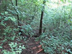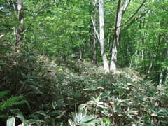 笹原を搔き分け、低木の小枝を躱しつつドンドン下る。樹林に覆われて相変わらず展望はない。左に小さい窪地を見て過ぎると、尾根の左側に短い草に覆われた作業道が現れる。