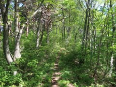 大峰山から縦走を開始し、坂城町と上田市の境界稜線を北に向かう。尾根は緑鮮やかな雑木林に覆われ、エゾハルゼミが盛んに鳴いている。良く踏まれた尾根道をゆるゆる下ると、水晶山への道と迂回路の分岐に着く。ここにも道標が建つ。