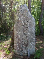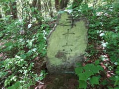 左に未舗装林道を分け(「堂叡山→」の道標あり)、林間を下ると明るく開けた窪状の斜面に出る。廃屋となった立派な民家があり、その背後の大きな杉の木立の中に玉垣に囲まれた石祠と石碑が建つ。「稲玉徳兵衛開墾の碑及び昌信(まさのぶ)社」と題する説明板がある。石碑には中央に大きく「開墾」、右上に「稲玉徳兵衛」と刻まれている。江戸時代に大変な努力で開墾された土地とのこと。現在はその一部がりんご畑として利用され、住人は既に山を降りて、通いで手入れされているようである。