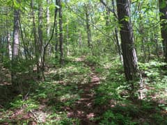 芝峠から尾根を直進して登る。相変わらず雑木林の緑に覆われた山道が続く。ゆるゆると登り、左(西)側の樹林が切り開かれて明るい大道山の頂に飛び出る。