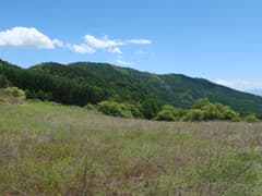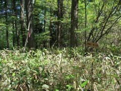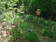 1164m標高点を越えるとなだらかな下りとなり、山中に忽然と現れた草地の広場に突き当たる。道標があり、直進方向は「和平高原登山口」、斜め右前は「和平高原(キャンプ場)」と書かれている。直進方向に広場を突っ切ってみたが、続きの道を見つけられなかったので、広場の右奥の作業道を下る。