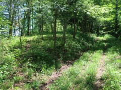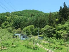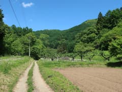 畑地を抜けて林間に入り、左に分岐する未舗装道に入る(ルート地図の「廃道開始」地点)。小さな沢を渡り、廃屋の横を通って耕作地跡の開けた草地を横断する。