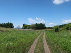 坂城町の側へ未舗装道を辿る。和平”高原”と称するだけあって、山上に広々とした平地が広がり、一部は畑地として作付けされている。左手には鳩ヶ峰辺りのなだらかな稜線を眺め、高原情緒に溢れる。一面に陽射しを浴びて日陰がないので、暑い。