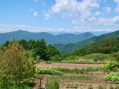 細い舗装道を下ると畑地から林間に入って、和平高原山の家の前を通る。週末キャンプに来た車と人が多い。周辺は和平公園として整備されている。農作業小屋が立ち並ぶ路地を過ぎ、耕作地越しに北アの眺めを楽しみながら下る。右に葛尾城跡への車道を分けると高原は終わり。樹林に覆われた山腹を斜めに下る車道となる。