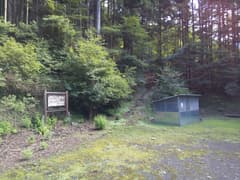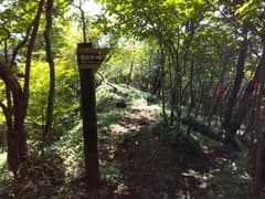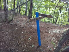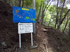 軌道跡に戻り、利平茶屋への登山道に入って下る。前回は道が荒れた印象があったが、その後、整備の手が入ったのか、特に問題なく歩ける。途中、「管理棟 0.9km →」の道標があり、左へ斜面を上がる登山道を分ける。篭山東尾根の1207m標高点への道のようだ。さらに山腹を斜めに下って、ふれあい広場のすぐ下の未舗装道に着く。ここの登山道案内の看板は新しいから、やはり近年、整備されたようだ。
