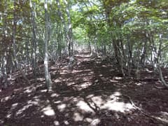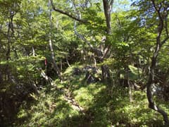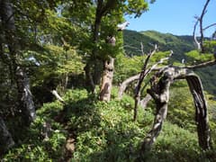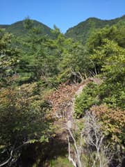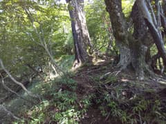 山腹を登り、すぐに尾根上に出て、左は鳥居川本流、右は笹倉沢の谷に挟まれた尾根道を登る。樹林に覆われて眺めはないが、右手の樹林の切れ間から笹倉沢の奥に駒ヶ岳を仰ぐ。沢の源頭は頂上稜線直下の崩壊地に突き上げ、なかなか険しく、深山の趣がある。