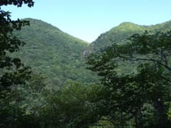 なおも露岩の多い尾根を登る。この辺りからアカヤシオが多く、開花期は見事だそうだ。もちろん、今は緑一色。ようやく傾斜が緩み、鳥居峠から駒ヶ岳に向かう登山道に合流する。暑さでバテて一休み。なお、篭山の頂上はここから南にだいぶ下ったところなので、登って来た尾根を篭山東尾根と呼ぶのは正確ではないが、ま、通称ということで。