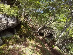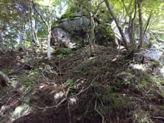 やがて露岩に木の根が絡む細尾根となり、岩尾根の右側をトラバース。その先は両側が崩壊した痩せ尾根となる。と言っても危険はなく、変化があって面白い。