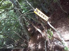 痩せ尾根を渡ると急傾斜の尾根となり、トラロープが張られた急坂を登る。右側は岩壁で、その上の縁を登ると、左手の立ち木に「ガケキケン 冬ムリ」の標識が架かる。そちら側は確かに急斜面で、冬季に凍結していたらかなり危なそうだ。しかし、こんなところまで冬に歩く人がいるんだなあ。マニアックだなあ、と感服する。