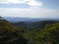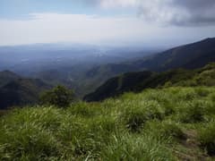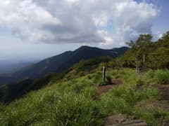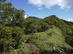 なおもトラロープが張られた急坂を登る。傾斜が緩むと、丈の低い笹原が現れ、少し高山らしい植生になる。標高が上がったが、風がほとんどなく陽も高くなって、かなり暑くなってきた。露岩が多く、その間を縫って急登する。振り返ると山麓に鳥居川の流れが光り、その向こうに広がる山並みを一望する。