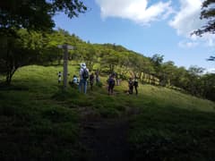 草原が広がる尾根を緩く登る。眺めが開け、振り返ると長七郎山や小沼がみえる。それにしても、背中を陽に炙られて、暑い。