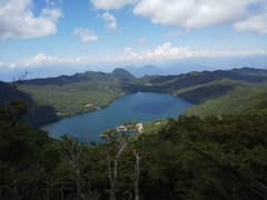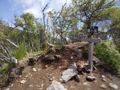 駒ヶ岳の頂上稜線の一角に登り着き、右斜面の崩壊地の縁を辿って駒ヶ岳の頂上に到着する。写真には写っていないが、頂上はハイカーさんでさらに大賑わい。大沼を俯瞰する定番の構図の写真を撮る。黒檜山へは大ダルミに一旦下って、大きな登り返しとなる。疲れたし、上空に雲が拡がり始めたので、今日はここまでとしよう。