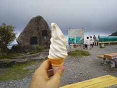 鳥居峠の駐車場は車でいっぱいで、観光客で賑わっている。振り返ると、駒ヶ岳の上部は既に雲ですっぽり覆われている。鳥居峠で今日一番の楽しみ。レストラン(赤城山頂駅サントリービアハイランドホール)でソフトクリーム(380円)を買い、レストラン前のベンチに腰掛けて食べる。甘く冷たくて、生き返る心地がする。