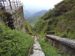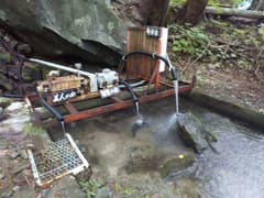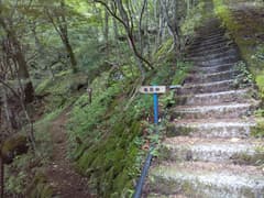 風化したコンクリの階段を下り、右に鳥居峠への迂回路、左に利平茶屋への道を分け、軌道跡から少し下って御神水に立ち寄る。前回、御神水に来た時は、まだ半壊した小屋が残っていたが、残骸が片付けられて、ポンプやパイプが剝き出しになっている。パイプから流れ出す水をペットボトルに汲んで飲む。冷たくて美味く、再度、生き返る心地。