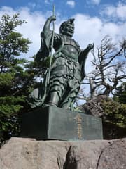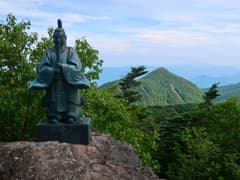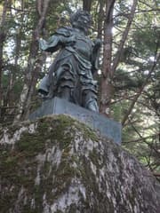 針葉樹林に覆われた稜線を絡んで登る。下生えの苔が瑞々しくて綺麗だ。程なく、稜線の大岩の上に建てられた三笠山神像を見る。これも立派な銅像だ。